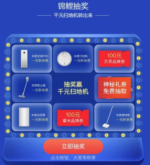 活动最引人瞩目的一定数“锦鲤抽奖”莫属,23日-28日,每人每天可参与三次抽奖,转发朋友圈还可追加抽奖1次,有机会赢千元扫地机。