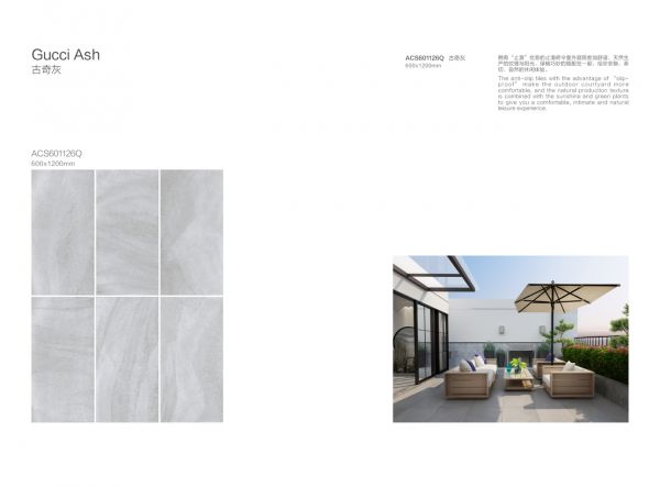 箭牌瓷砖——古奇灰,浅灰色的砖面,纹理、色块变化莫测,带有一种神秘感;同时,拥有“止滑”优势的止滑砖,令室外庭院愈加舒适,天然生产的纹理与阳光、绿植、木质家具......巧妙的搭配在一起,给你安稳、亲切、自然的休闲居家体验。在静谧的家居空间里,柔和的灯光洒下来,这款低饱和度的地板砖面,将家居气氛烘托出别样的温馨、舒适。