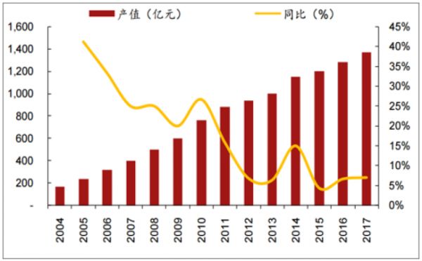 放眼全球市场,中国可谓是当之无愧的全球最大的木门制造和消费中心。从国内行业规模来看,2017年我国木门行业规模已超过1370亿元,在经历了2004年到2017年年均17.41%的年均复合增长后,我国木门行业的需求规模已接近1500亿。(数据来源:中国产业信息网)