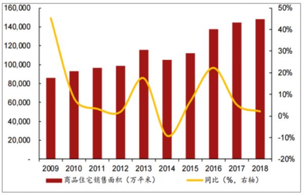 2008年至2018年,我国商品住宅年销售面积从59,280万平方米增长至147,929万平方米。