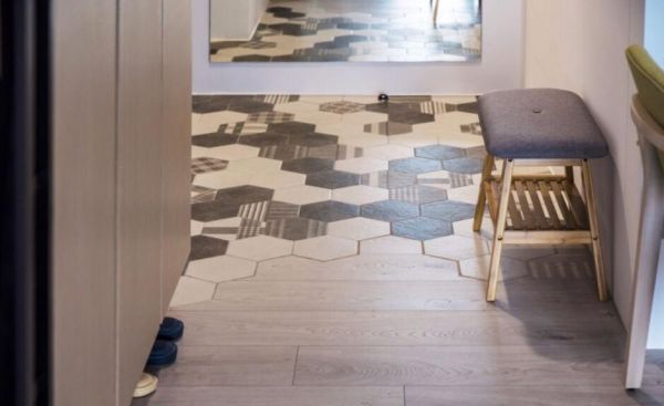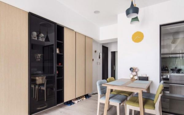 玄关以六角瓷砖铺设地坪,划分出微型落尘区,壁面再贴附穿衣镜,让屋主出门前能够自在端详穿搭,每天都带着好心情外出。木作鞋柜以腾空方式呈现,下方可摆放拖鞋,局部以黑色层板、玻璃门片的开放柜体,做为风格逸品的展示且有效延伸视觉。依着简单的白色壁面挂上电视,电器柜串连一旁的收纳柜,强化生活的实用机能;客厅里,利用灰色绒布沙发搭上深蓝色的背墙,墙面上以黑白视觉的现代风画作点缀,挹注一股摩登时尚美感;公共领域的角落摆上木作餐桌与跳色单椅,形塑开放的用餐空间;而隔着玻璃拉门的界定,则拉出料理的厨房领域,玻璃材质的穿透性,让空间更显开放与流动气息。
