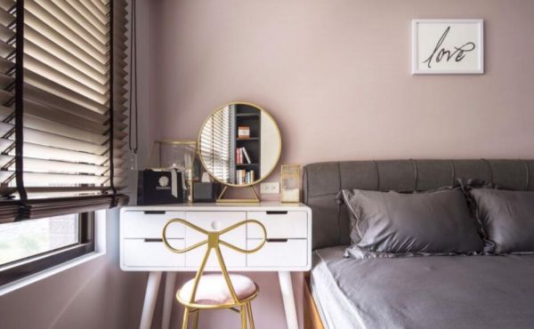 主卧空间里以粉色系定调,搭配蝴蝶结椅背的精致座椅、梳妆台与圆镜的设计,诠释屋主拥有时尚优雅的迷人风范。