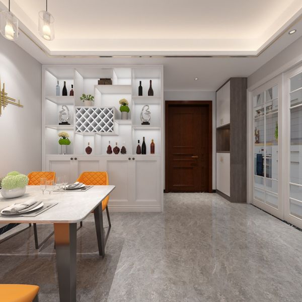 餐厅这一块区域的通体用色偏素,女主更倾向于富有亲和力的用餐氛围,设计师龚工选择用女主喜欢的橙色提亮空间,点燃氛围。