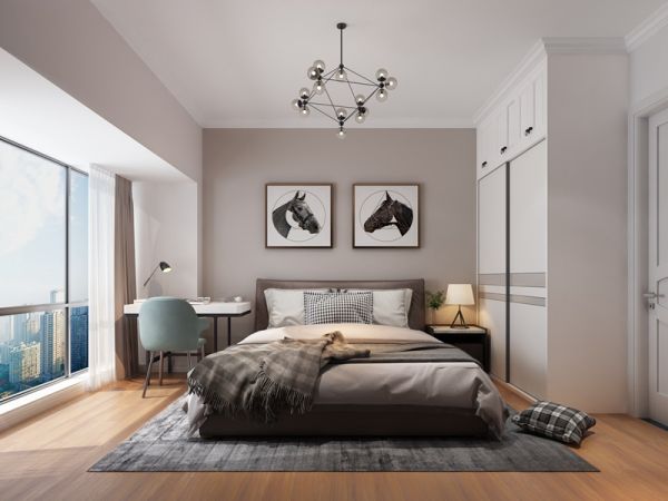 女主和先生住的主卧在色彩选用上与家庭动区有所出入,客餐厅等区域虽然主题色也是浅色系,但用来修饰空间的辅助色有用到一些明亮活力的橙、黄,而主卧则使用清一色的淡雅色调,出来的温馨效果虽然不如客厅等区有活力,但更符合女主喜好。