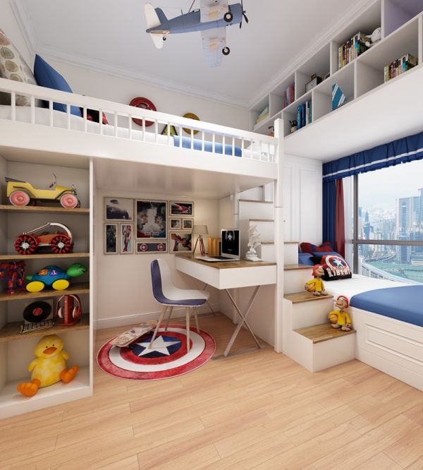 在小朋友的儿童房设置一个小loft,上床下桌实现对8.9㎡小空间的充分利用,还能在腾出的角落设置储物柜,用来存放小孩玩具、衣物。