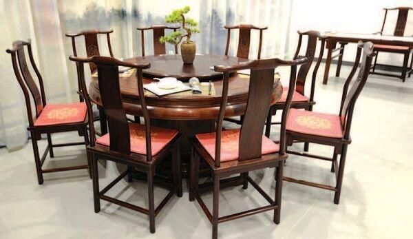 木与圆的相遇,延伸了人们对红木圆桌文化的遐想。 此款红木圆餐桌既保留了传统的文化理念, 也加入了设计师新颖的创作。天然木纹理和加厚牙板形成的桌面搭配独 特的六角踩珠底座,坚韧耐用,承受力强,另还有设置橱门方面收纳。 餐桌含 138CM、155CM、180CM 多尺寸更方便居家选择,搭配同系列福寿餐椅,浑然一体。