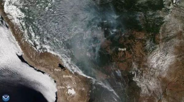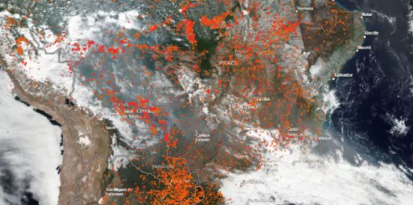 大火烧起的烟雾面积覆盖半个巴西,8月20日,千里之外的圣保罗被烟雾笼罩,城市仿佛从白天进入了黑夜,这样的情况竟持续1个多小时之久。NASA22日发布的卫星图像显示,地表冒出的巨大的烟雾即使在太空也清晰可见。无数原始雨林独有的野生动物无处可逃,惨死在熊熊大火里。