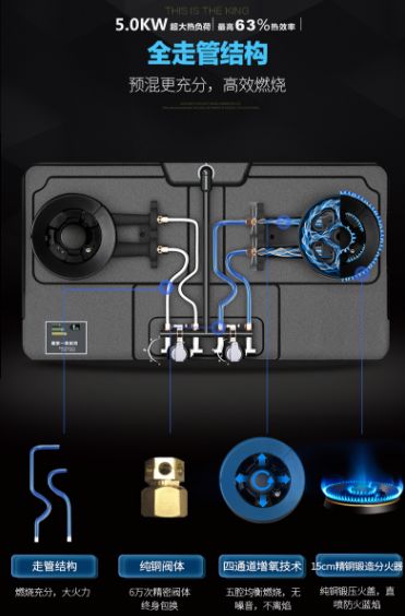 全走管结构,纯蓝炬火焰,15cm精铜锻造的的分火器,让燃气与氧气的燃烧更充分,确保长期蓝焰燃烧。并且设有人性化的防风出火,双火孔稳定的设计,致力于安全烹调环境,始终保持最佳燃烧状态。