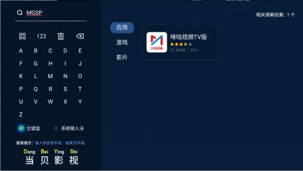 第二步:在当贝市场中搜索“MGSP”即可下载咪咕视频TV版