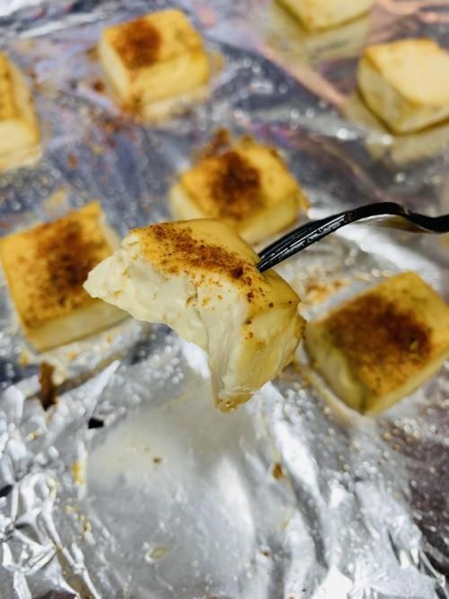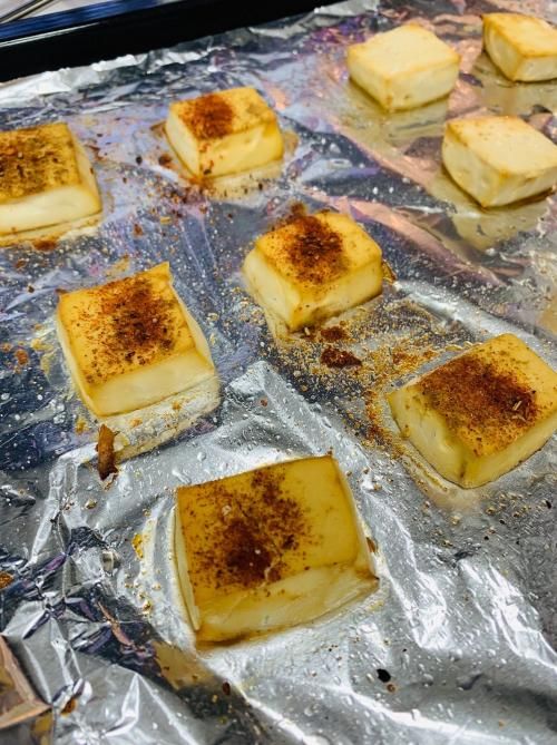 路边的烤豆腐我同样是一次做成功的。在切好的豆腐上面刷上生抽,洒上辣椒粉、孜然粉、盐,直接送进蒸烤箱中烤。烤好的豆腐非常入味,表面脆脆的,味道也很香,比我以前吃的还好吃。在家做的好处是卫生可以放心,食材也很健康。