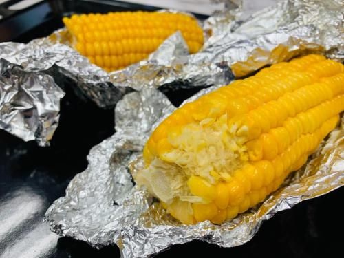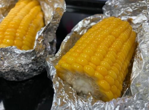 我在玉米的表面刷了一层炼乳、一层蜂蜜跟三块黄油一起用锡纸包起来放进了蒸烤箱。蒸烤箱烤的玉米的口感跟传统炭火烤的很不一样,传统炭火烤出来的玉米的表面会有一种焦焦的感觉,而蒸烤箱烤的玉米是那种嫩嫩的感觉,口感甜甜的,跟肯德基玉米的口感一样,出乎意料的好吃。