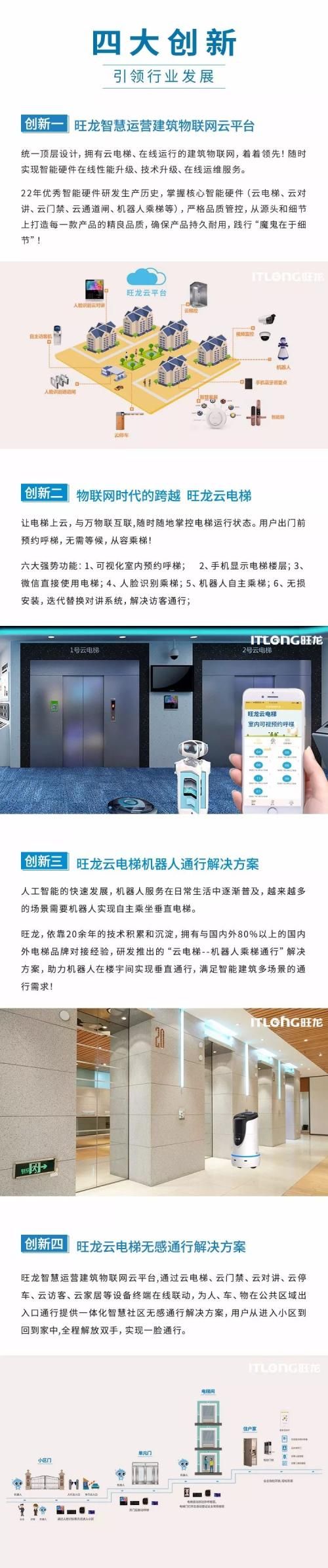 从刷卡电梯发明企业到云电梯发明企业、机器人乘梯发明企业,旺龙一直致力于技术与产品的研发创新,为客户创造价值,为用户全面构建智慧生活。截止目前,旺龙在全国拥有2万余社区、6千万余用户稳定运行。2019年,旺龙重磅推出四大创新产品与解决方案: