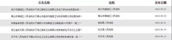 8月份,佛山市禅城区人民法院、绍兴市越城区人民法院、开平市人民法院、庆元县人民法院、枞阳县人民法院分别发布公开拍卖公告,高斯丹智能卫浴科技、敏特卫浴、华业卫浴等共5家卫浴的所属机器设备、存货等财产被公开拍卖。其中,高斯丹智能卫浴科技、敏特卫浴、华业卫浴等企业的卫浴设备等资产将在9月份进行公开拍卖。