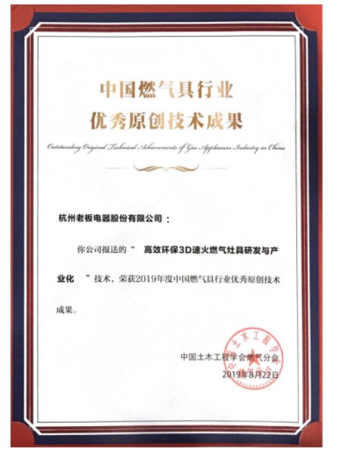 老板电器荣获2019年度中国燃气具行业优秀原创技术成果
