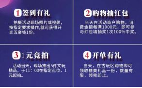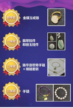 活动当天,在古玩活动商户购物,消费金额每满1000元,即可参与红包墙抽奖1次,100%中奖!特等奖:金镶玉女戒;一等奖:翡翠挂件/和田玉挂件;二等奖:施华洛世奇手链+项链套装;三等奖:手链。