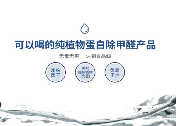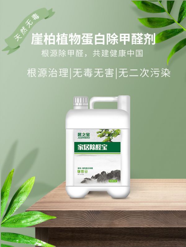 以崖柏因子和植物蛋白为主要原料,采用高效生物催化、氧化、水解技术,从植物中提取蛋白质活性酶、天然植物精华,经特殊工艺制成的植物蛋白除醛剂。产品采用强效渗透配方,使其直达材料深层,利用渗透聚合反应原理,与建材和气中的游离甲醛等有害物质迅速结合反应,生成一种新的,无色无毒、不分解的水溶性蛋白凝胶类结晶体和水分。