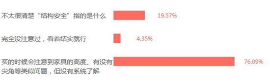 另据新浪家居《儿童家具标准认知调查》数据显示,大部分家长虽有安全选购的意识,但是在认知上却并不准确。在“有没有注意过家具上的警示标志”问题上,有26.09%的人表示“不知道什么是警示标志”;在“是否注意到结构安全”问题上,19.57%的家长表示不太很清楚“结构安全”指的是什么,76%的家长表示并没有系统了解,4%的则以“看着结实”作为衡量安全性的要点。