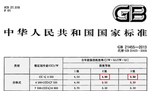 上图是大金E-MAX7系列的3等级的分体机的能效标识,红圈中显示这款产品的能源效率(APF值)是3.99,而能源效率(APF值)的国家标准如下图: