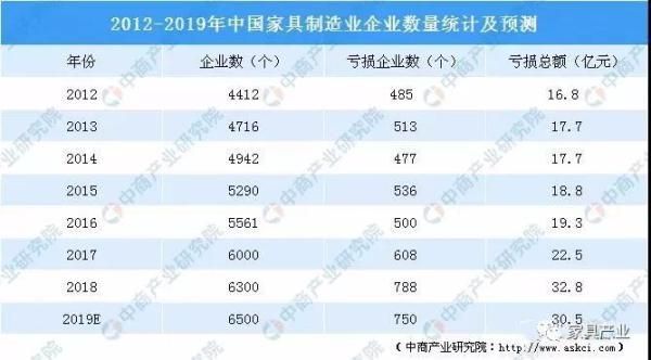据数据显示,至2018年12月末,我国家具行业规模以上企业达6300家。其中,家具制造业亏损企业数量在2018年12月末达788个,亏损面为12.5%。