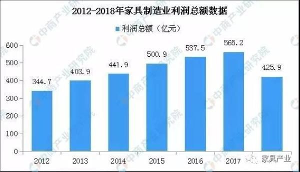 近年来,我国家具制造业利润总额与营业收入同步,保持稳定上涨。据国家统计局初步统计数据显示,2018年全年家具制造行业实现利润总额达到425.9亿元。