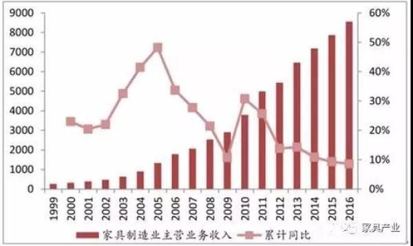 自 2000 年开始,中国家具制造业进入了成长的快车道,营业收入保持稳步上涨,产能占据全球家具总产能 30%以上,第一大家具制造国名副其实。