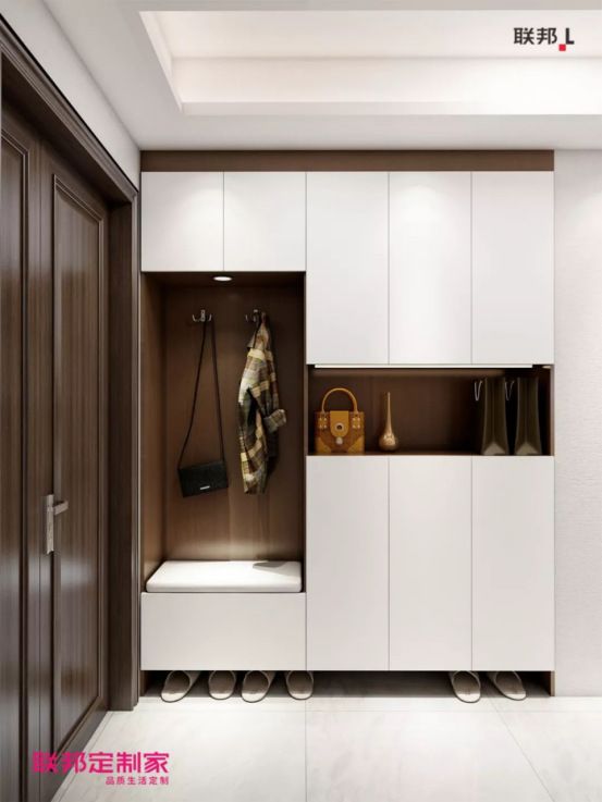 胡桃色+白色的定制入门柜,干净利落,简单大方,一进门就能感觉到浓浓的禅意。