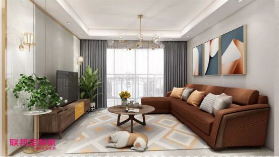 客厅采用爱马仕橙色作点缀,让原本平淡的色调多了一丝活力。