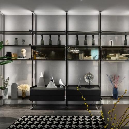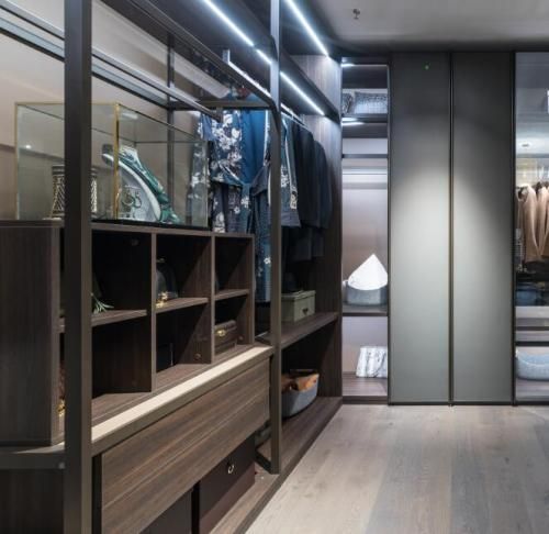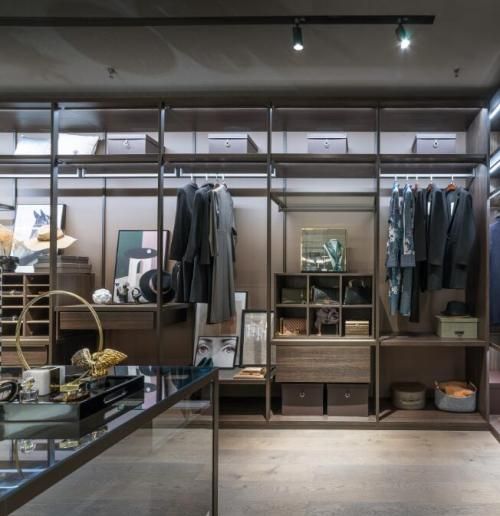 金属、玻璃、木制、皮质、布料、五金、灯光之间的材质壁,在这里全部被打破,以一种简单不刻意的方式和谐共生,组合成平开门、移门、衣柜、书柜、护墙等空间模块。极致的意式极简风,几近“变态”的细节处理,一线一面、一物一什,都在诠释“低调奢华有内涵”这一金句。