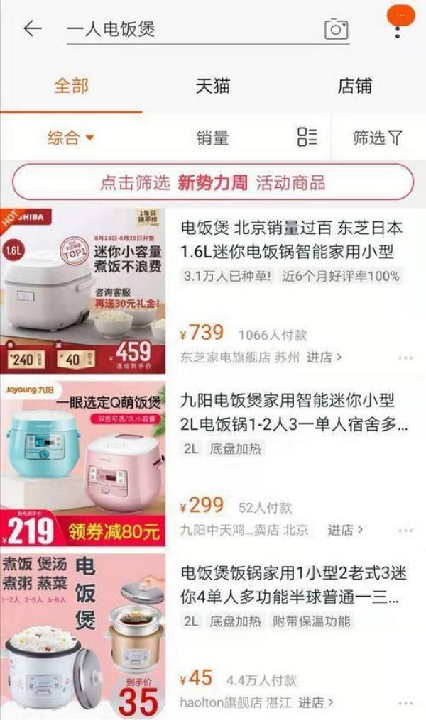 不仅是线下,在线上,搜索一人电饭煲、迷你冰箱、小型洗衣机,可以看到不少热卖品。在某电商平台,一些品牌的单人电饭煲、小冰箱等月销量达到上万件。
