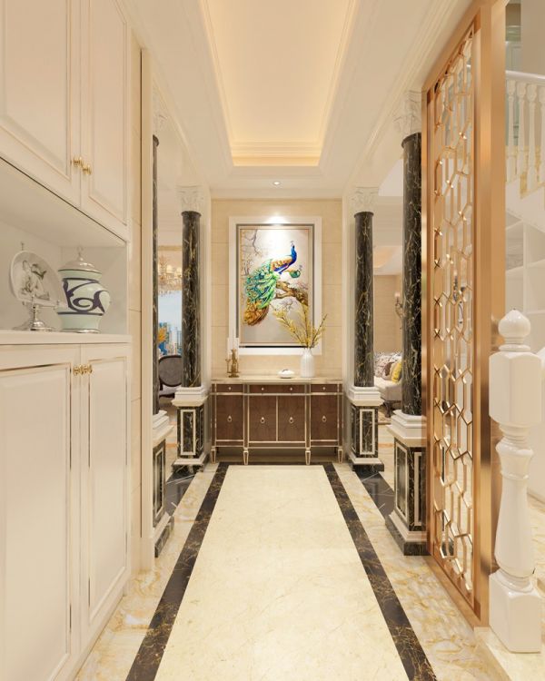 在跨过入户门,踏进这个家的第一步,你便能感受到这金碧辉煌的空间带给你的震撼。简奢造型的玄关,是这间大宅的华丽前奏,器具的优雅丝毫不输大篇幅的奢侈造型。