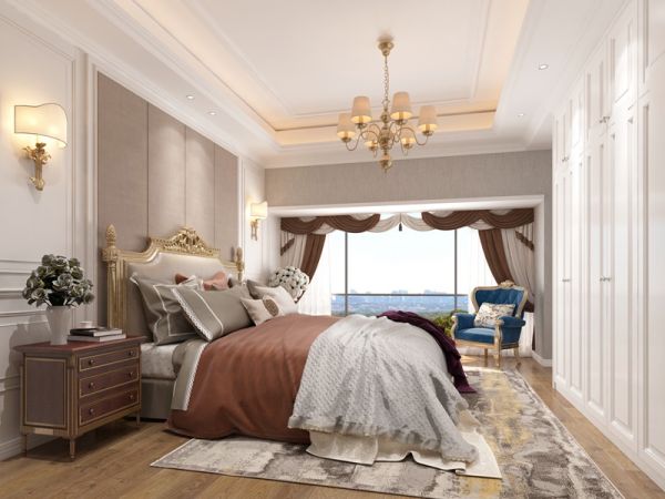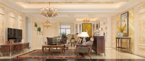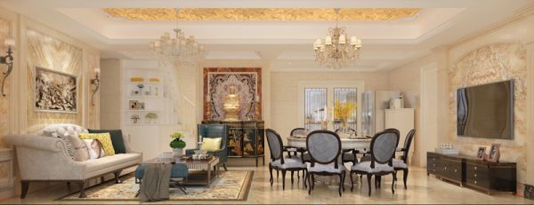 客餐厅的全开放式造型,连通起两个功能区的气韵,放下轮廓稍繁杂的欧式软装后也不会显得很拥挤。为了不破坏客餐厅在视觉上的整体性,两区天花使用同一个吊顶,吊顶内侧还贴了金箔,呼应空间的奢华主题,还能强化一级吊顶的立体效果。