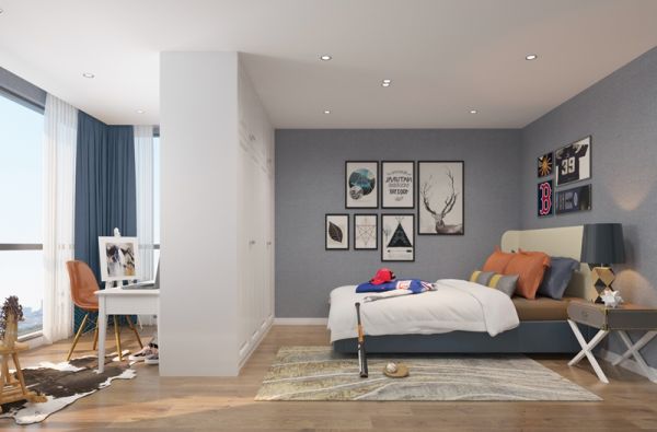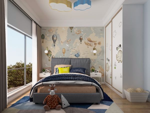 人们对未知世界的构想,很大一部分来自身边事物的暗示,作为一个小家庭未来的脊梁,孩子总被寄予不一样的愿望。儿童房的地球板块墙布,还有墙布上充满探索意味的热气球插画,意喻男孩儿对这个奇妙世界的无限遐想,有趣也有爱~