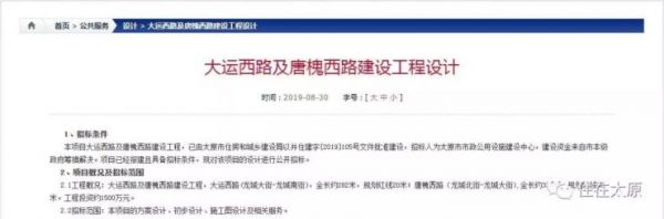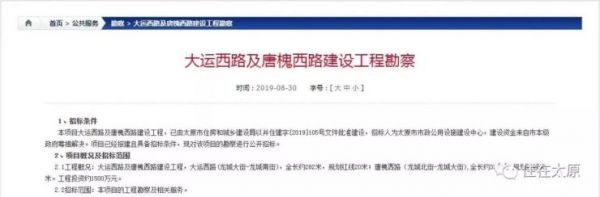 据悉,本项目大运西路及唐槐西路建设工程,已由太原市住房和城乡建设局以并住建字[2019]105号文件批准建设,招标人为太原市市政公用设施建设中心,建设资金来自市本级政府筹措解决。