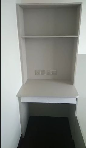 主卧是业主夫妻两人的房间,业主有时候需要在家办公学习,所以床边设计书桌柜,同时此柜还要兼做梳妆台使用,所以加上抽屉放化妆品、梳子、折叠镜子之类的小件物品,上方开放柜主要用来放书籍。