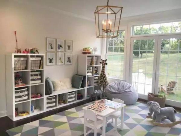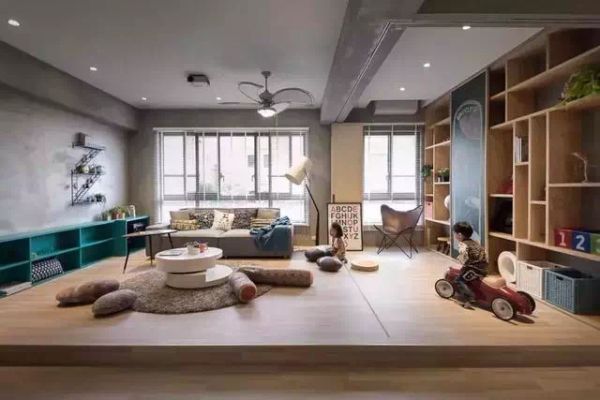 对于家里有孩子的家庭来说,客厅可以分成两个区域。一个区域可以给孩子打造成儿童区供孩子玩耍。另一个区域可以当会客休闲区,家里来客人也不耽误。