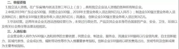 据了解,广东省企业联合会、广东省企业家协会在今年5月发布了《关于组织申报2019年广东企业500强及推荐中国企业500强的通知》,通知对本次申报内容、申报资格、入选标准、申报程序等进行了相关说明。其中,申报2019年广东企业500强、民营企业100强,2018年主营业务收入须达到9亿元(人民币);制造业100强主营业务收入须达到8亿元;创新企业100强主营业务收入须达到3亿元。