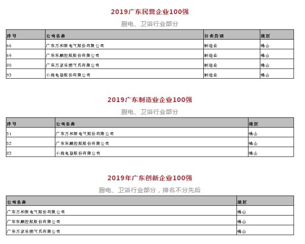 此次一同公布的还有广东民营企业100强、广东制造业100强、广东创新企业100强等榜单。其中,万和、东鹏除入围2019广东企业500强榜单外,还同时被选为广东民营、制造业及创新企业100强,成为本次评选中最耀眼的厨电、卫浴企业。此外,万家乐燃气具、小熊电器也分别上榜两个除广东企业500强之外的榜单,表现同样抢眼。
