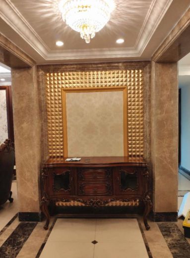 玄关整体以沉稳温馨的暖色调为主,非常吸引眼球,亮点在于金色墙砖铺贴的玄关墙,彰显大气恢弘的气势。与之匹配的玄关桌,造型雅致,留有的挂画位置再搭配一幅艺术挂画,大气的基础上就又增添了几分优雅气质。