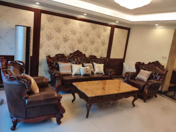 法式风格的沙发组合,造型沉稳大气,柔和的雕花又彰显细腻雅致,尚欧国际家居实木、皮质以及茶几几面的大理石,都能很好地衬托出居室高雅的气质。