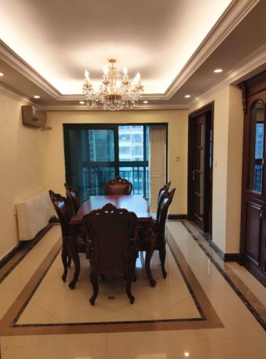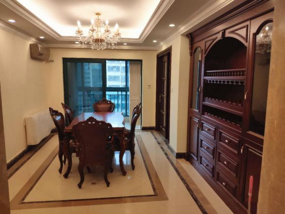 独立餐厅空间里,餐桌顶部的水晶吊灯作为主灯,渲染了整个空间氛围,外部一圈射灯,确保充足的餐厅光线,明亮的餐厅里,更容易激起家人的用餐食欲。端正的餐桌椅置于中间,营造出满满的用餐仪式感。