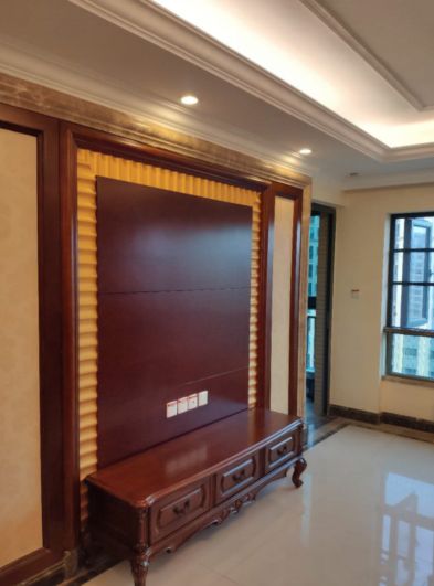 定制的电视背景墙,同样选用了精气神十足的白色+红棕色的色调搭配,中间一圈金黄色装饰增强气势。业主选用了中式较为传统的色调搭配,让空间在彰显法式的优雅时,又多了几分中式的敦厚沉稳。