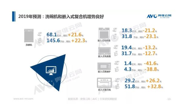 7月30日,中国家用电器研究院和全国家用电器工业信息中心联合发布的《2019年中国家电行业半年度报告》指出,2019上半年国内家电市场零售额同比增长率为-2.1%,相比一季度-3.1%的同比增长率,下滑趋势有所缓和。出口方面则保持增长势头,2019年上半年家电累计出口额同比增长率为5.5%。在厨电领域品类的表现上,虽整体规模增长乏力,但嵌入式厨电等新兴品类均保持了高速增长。奥维云网(AVC)厨卫电器事业部则总结,从2019上半年表现来看,嵌入式复合机零售额增长23.9%,零售量增长34.6%,增长迅猛。