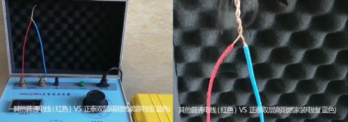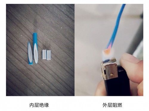 为进一步了解正泰居家双层高阻燃环保家装电线,笔者准备了一根蓝色的正泰居家电线和一根红色的普通电线进行了专业的燃烧和耐热测试,共开展了三个实验。