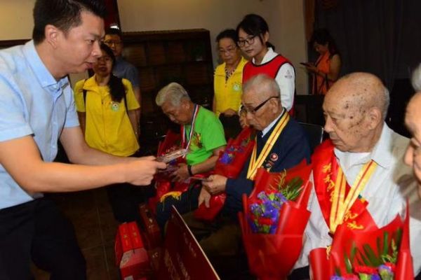 9月3日在南昌市西湖区优秀企业家宣讲团红色家风馆来自南昌平均年龄95岁抗战老兵:陈震卿、张第富、叶道清、席树荣等8名抗战老兵表示今天我们在9月3日纪念抗战胜利74周年的同时,还在不断从内心发出强烈呼声,70多年了,无论日子过得多艰难,我们抗战老兵都希望祖国强大,也期望国家不要把我那些为抗战牺牲的战友们遗忘了。优秀企业家宣讲团江剑平秘书长说:今天,我们纪念抗战胜利74周年,我们必须铭记历史、不忘初心、从事教育行业多年,红色是我们的灵魂,真诚欢迎老兵爷爷来我井冈山基地做客休养。