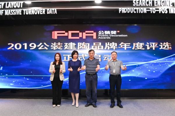 佛山市陶瓷行业协会秘书长尹虹、佛山中国陶瓷城集团常务副总裁兼商业运营中心总经理余敏、佛山中国陶瓷城集团材易采总经理文晖、佛山中国陶瓷城集团会展中心总经理龙清玉共同启动“公装奖—2019公装建陶品牌年度评选”。