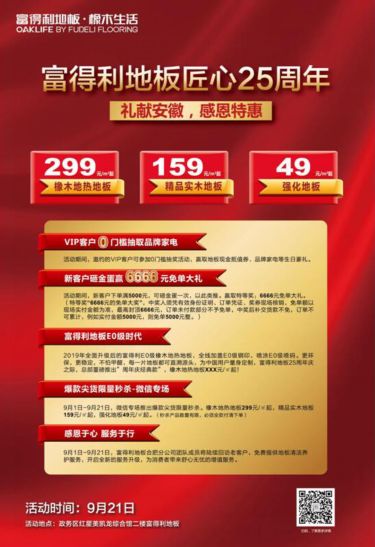 强化地板、精品实木地板,以及橡木地热地板均以超低价亮相,微信秒杀即可获得;VIP客户享有0门槛抽取品牌家电的特权;新客户可通过砸金蛋赢取6666元免单大礼,下单满5000元,可砸金蛋一次,以此类推,上不封顶;呼应“匠心25周年”主题,全面升级后的富得利E0级橡木地热地板也将隆重出镜,富得利总部特推出“周年庆经典款”地板,价格同样跌破底线。不仅如此,合肥富得利地板也开启了全新升级的服务模式,9月1日-9月21日,富得利地板合肥分公司将针对老客户提供免费的地板清洁养护服务,用专业技能和暖心态度服务消费者,助力品质地板生活走进万千家庭。