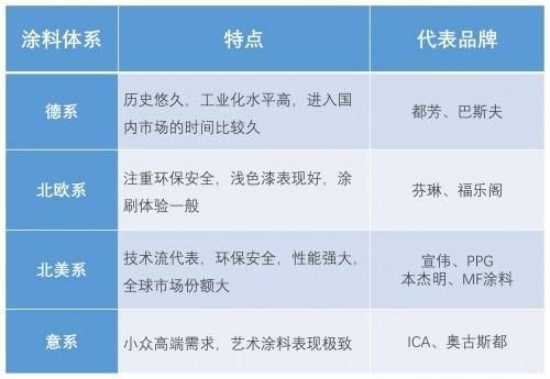 目前国内的进口涂料界,以德系、北欧系、北美系、意系4体系为主,品牌众多。总的来说,4大体系各有特点,可以概括如下: