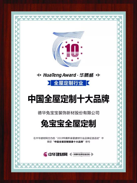 在由中华建材网首届举办的“华腾杯”2019年度十佳品类奖和十大综合奖网络评选活动中,兔宝宝全屋定制凭借多年来对自然、健康、环保理念的坚持与创新及健康品牌口碑,摘夺“2019中国全屋定制健康衣柜十大品牌”奖项。