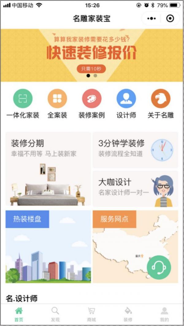 名雕家装宝,为您提供管家式家装服务。客户可通过小程序在线查看各种装修案例、在线咨询设计师、免费在线报价,实现电子签单、合同一键支付,施工动态实时查看。还有汇聚了 1000以上环保材料品牌的网上商城-名雕易装建材馆,可随心挑选装修材料与家私。客户将能实现足不出户,随时随地快速全面地了解装修全流程。