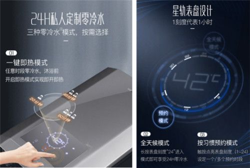 另外该系列产品设置了三种零冷水模式:一是即热模式,触按“即热”键后,热水速达,畅享舒适热水;二是预约模式,全天24小时随意预约,在设定时间内自动完成加热并保温;三是全天候模式,可享受24小时零冷水效果,热水随心所享;况且还具备STF低水温波动专利技术支撑,实现±0.5℃无感温差,杜绝水温忽冷忽热。